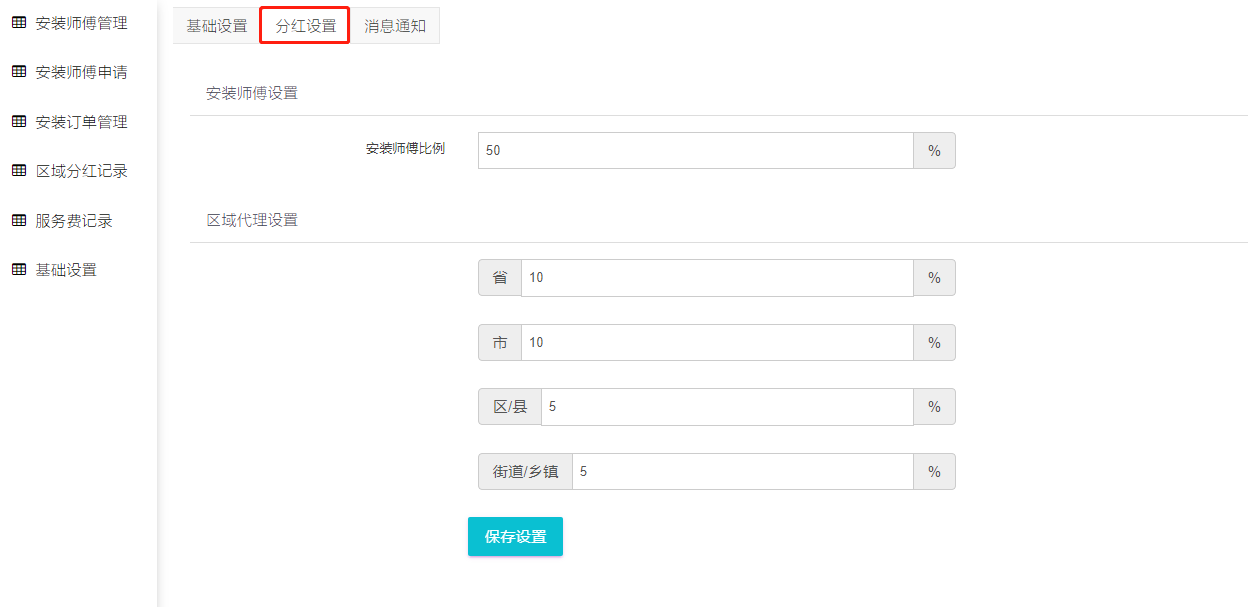 安装费用为100元时,安装师傅可以分得100*50%=50元的服务费,安装师傅所在区域的省代获得10元,市代获得100*10%=10元,区代5元,街道代理获得5元(如图)